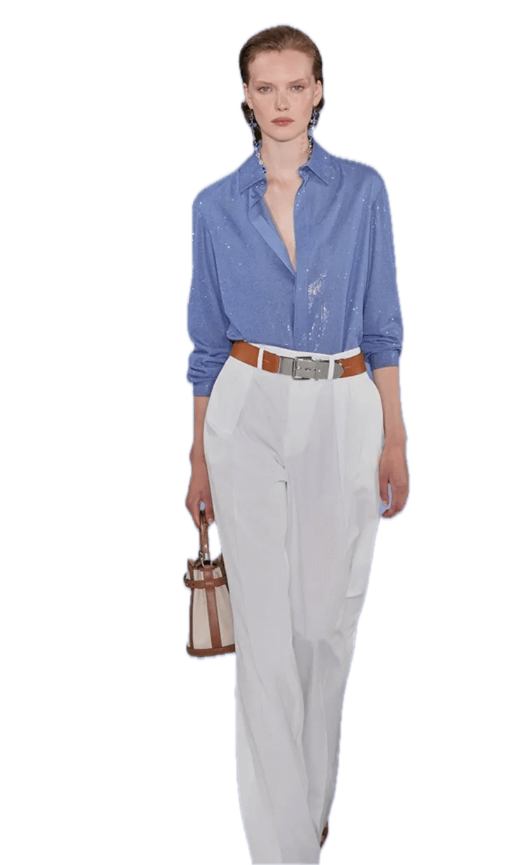 矢车菊蓝常被视为忠诚和希望的象征,它清新淡雅的色彩给人带来宁静与美好的感觉。在2025春夏的女装秀场中,矢车菊蓝大部分用于衬衫,衬衫裙或者连衣裙。色彩搭配主要是黑白色。